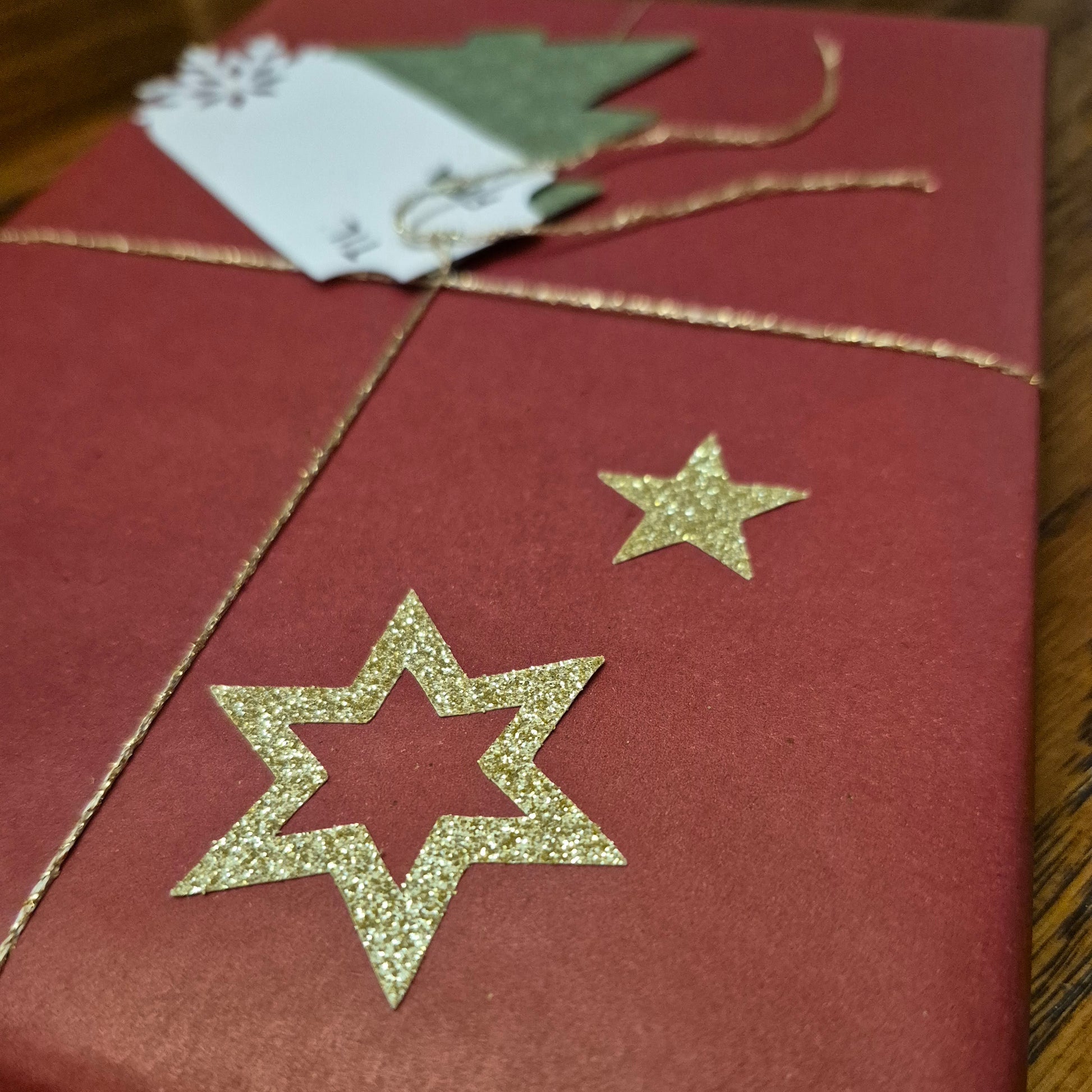 Fiks ferdig, klar til å legges under treet. Vakker gaveinnpakning i papir med glitterstjerner. Inkluderer bokmerke.